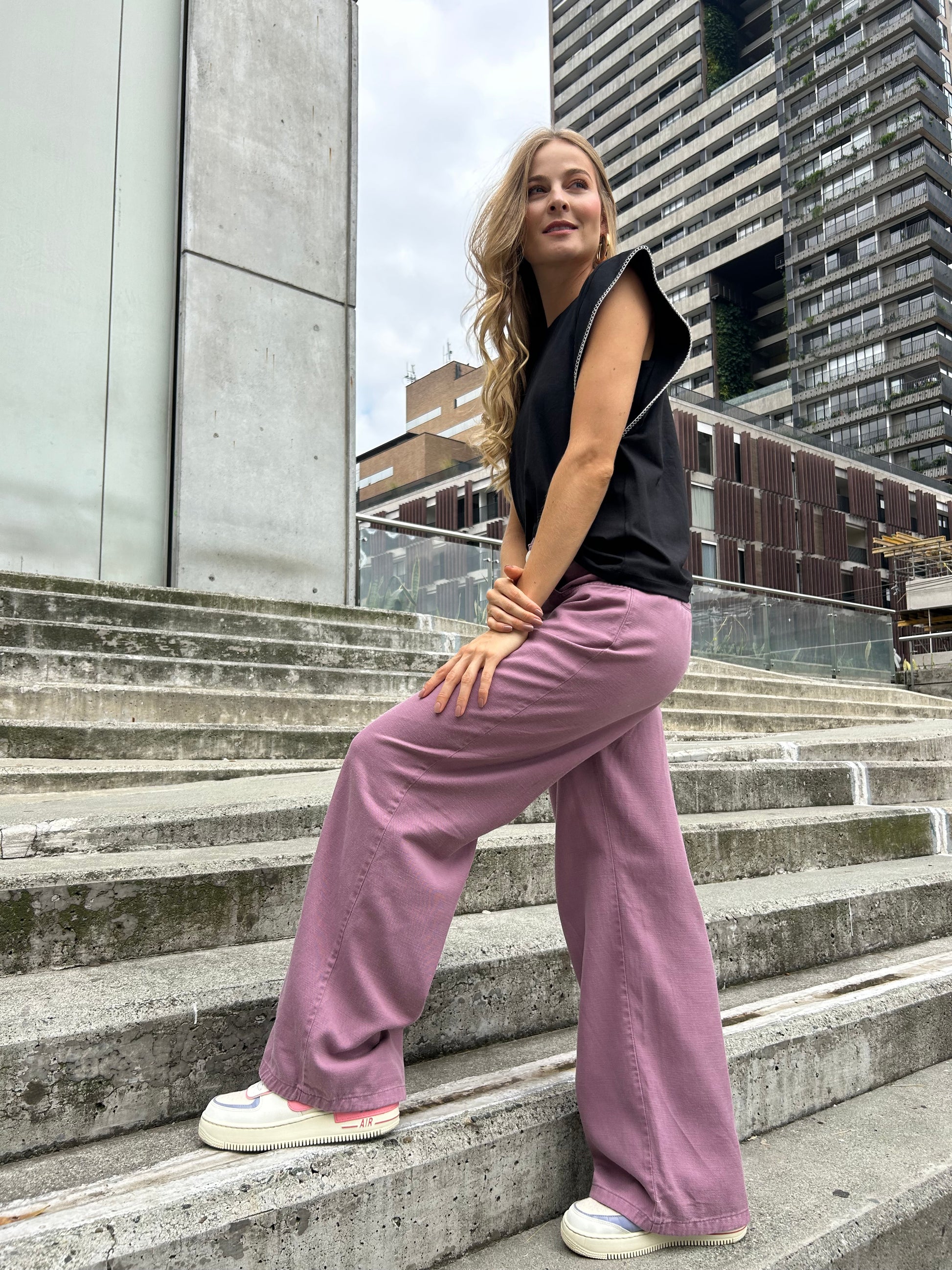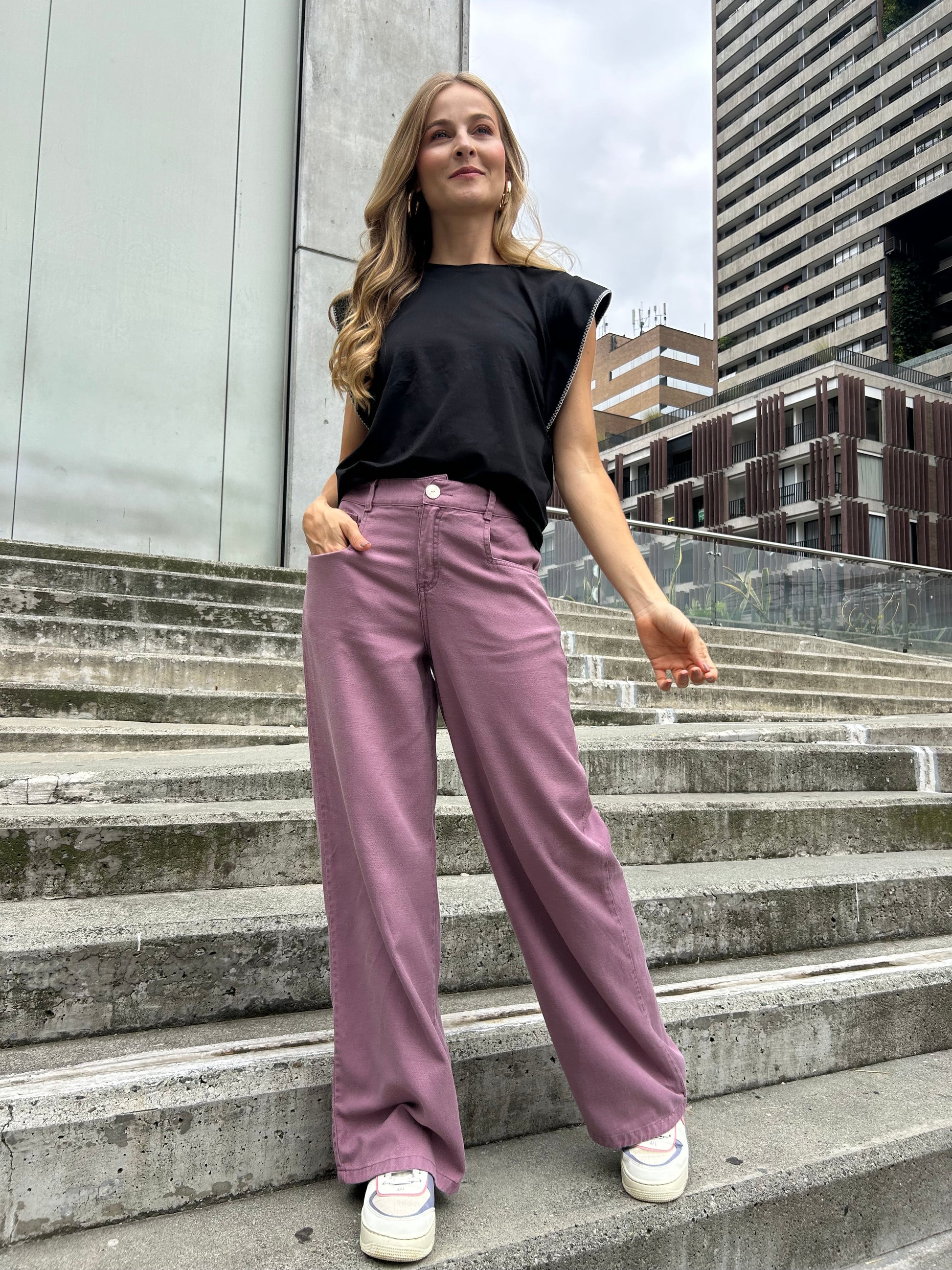 Descipción: Pantalón fit wide leg, tiro alto, es ajustado en cintura y suelto en cadera y pierna, con bota de corte amplio. Ajuste con cierre y botón, elástico en parte posterior para mejor ajuste en cadera.